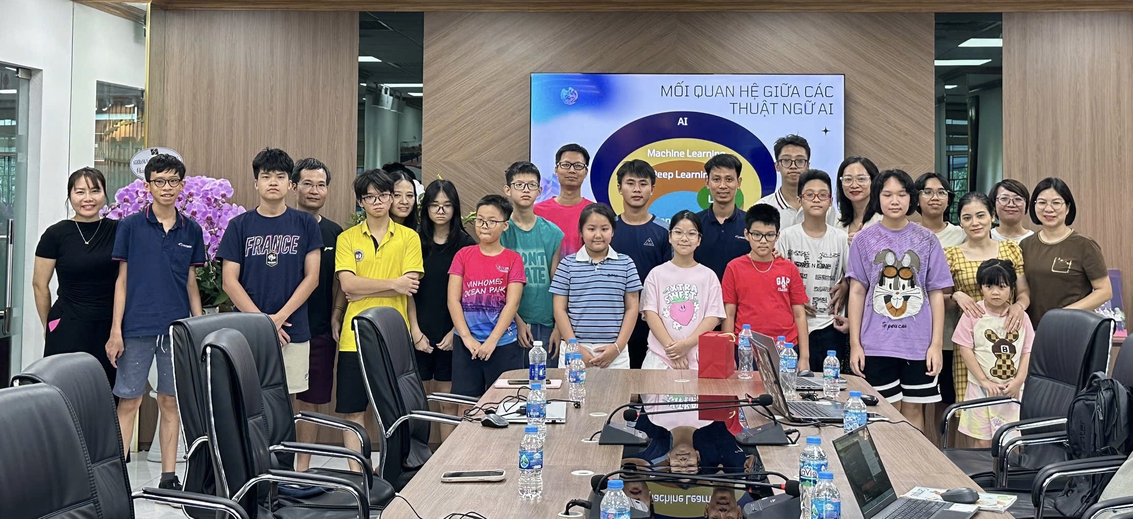 Ảnh chụp với các em học sinh và phụ huynh của CEO Nhà Long Biên (HanoiBA) tại buổi học “Làm bạn với Trí” - hoạt động khám phá thế giới AI qua các công cụ