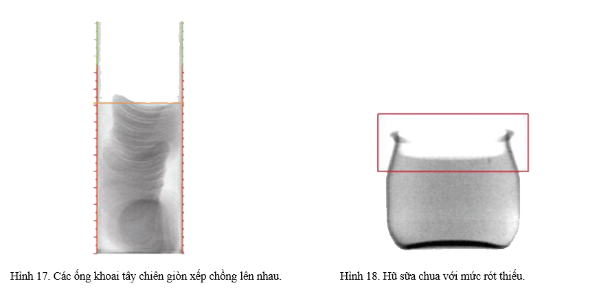 Trong hình 17, chồng khoai tây chiên giòn đã bị đổ nghiêng và một số khoai tây chiên bị hỏng. Bằng cách kiểm tra chiều cao của ngăn xếp, phân tích tia X có thể phát hiện ra rằng mức lấp đầy đã giảm xuống dưới mức tiêu chuẩn có thể chấp nhận được và sẽ loại bỏ gói.