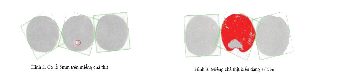 Loại phân tích hình ảnh này xác định các sản phẩm trông có vẻ không ổn, điều này có thể bao gồm sản phẩm quá dài, ngắn hoặc không đủ rộng (so với thông số kỹ thuật đã thỏa thuận trước) ngay cả khi chúng có trọng lượng chính xác, ở đúng vị trí và không có chất gây ô nhiễm. Nó cực kỳ hữu ích cho các nhà sản xuất sản phẩm phụ thuộc vào sự hấp dẫn trực quan. Ví dụ, một trong ba miếng chả thịt trong hình 2 có một lỗ trên đó. Nó hiển thị như một mảng sáng giữa màu xám đồng nhất. Một trong ba miếng chả được thể hiện trong hình 3 là miếng chả bị biến dạng.