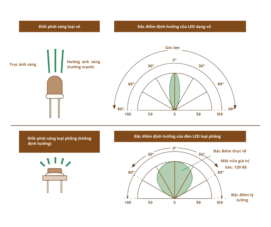Đèn LED chủ yếu được phân thành các loại vỏ và chip. Loại vỏ phát ra ánh sáng thẳng (sáng khi nhìn thẳng từ phía trước) trong khi loại chip khuếch tán ánh sáng theo chiều ngang. Cái trước thường được sử dụng cho đèn giao thông và cái sau để chiếu sáng nền cho màn hình LCD điện thoại di động. Ngoài các loại này, còn có loại phẳng với độ trực tiếp và độ khuếch tán cân bằng tốt. Đèn LED có nhiều ưu điểm khác nhau, bao gồm tiêu thụ điện năng thấp, vòng đời dài (khoảng 40.000 giờ), phát thải CO2 thấp và các phần tử phát ra ánh sáng nhỏ như hạt gạo. Những ưu điểm này làm cho đèn LED cũng thích hợp để giảm kích thước và trọng lượng của vật phẩm. Hơn nữa, đèn LED thân thiện với môi trường do phát xạ tia cực tím và tia hồng ngoại thấp.
