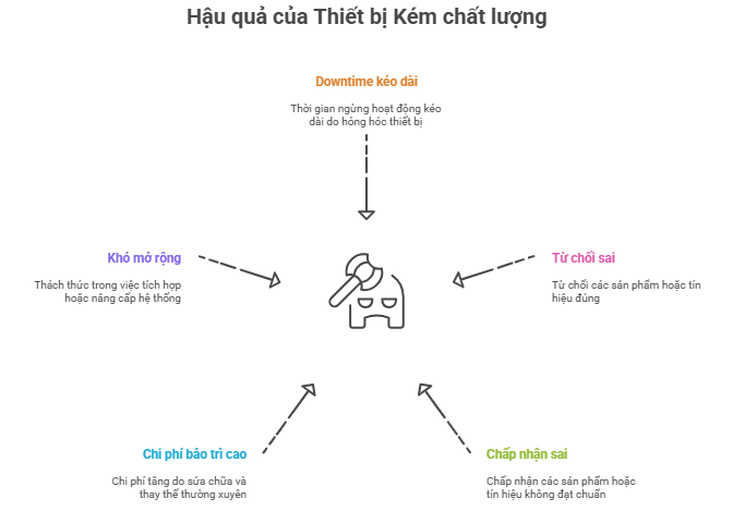 - Downtime kéo dài: Thiết bị kém chất lượng dễ xảy ra lỗi, phải dừng dây chuyền để hiệu chỉnh hoặc thay linh kiện.