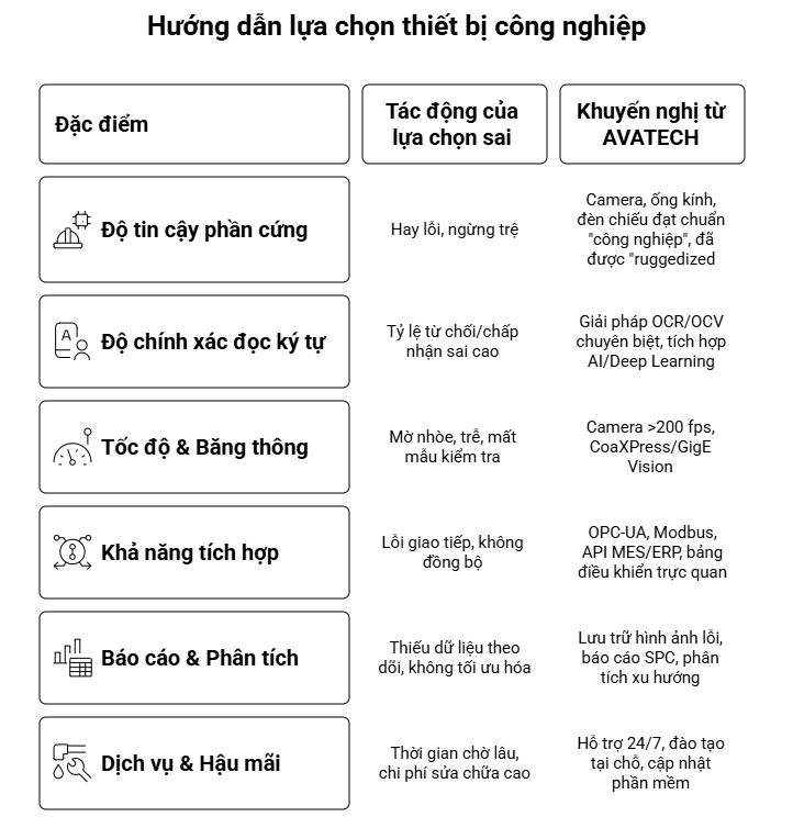 Việc chọn một hệ thống thị giác máy “giá rẻ” thật ra không đơn giản chỉ nhìn vào số tiền bỏ ra ban đầu. Bạn cần xem xét tổng chi phí sở hữu (TCO): downtime, chi phí bảo trì, phế phẩm, và khả năng mở rộng. Bằng chiến lược AVATECH – Advanced Vision + Smart Software + Total Insight, chúng tôi cam kết giúp bạn: