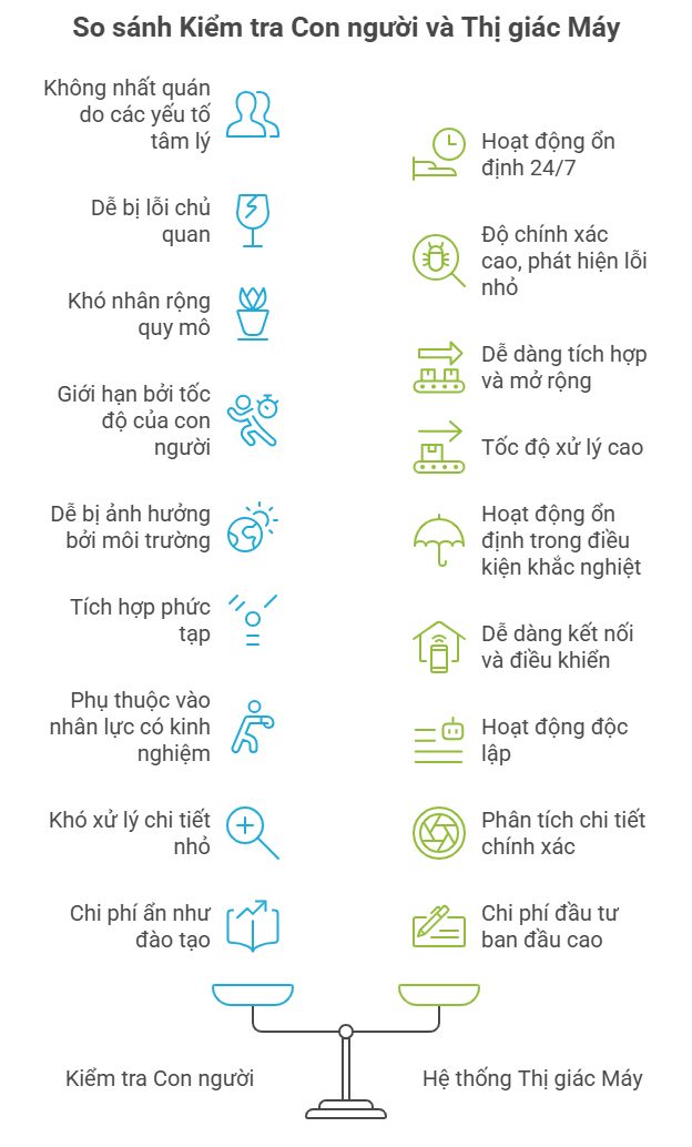 Ngược lại, hệ thống thị giác máy không biết mệt. Chúng kiểm tra chính xác như nhau cho từng sản phẩm, từng phút, suốt 24/7, bất kể thời tiết, ca kíp hay năng lượng của nhân viên.